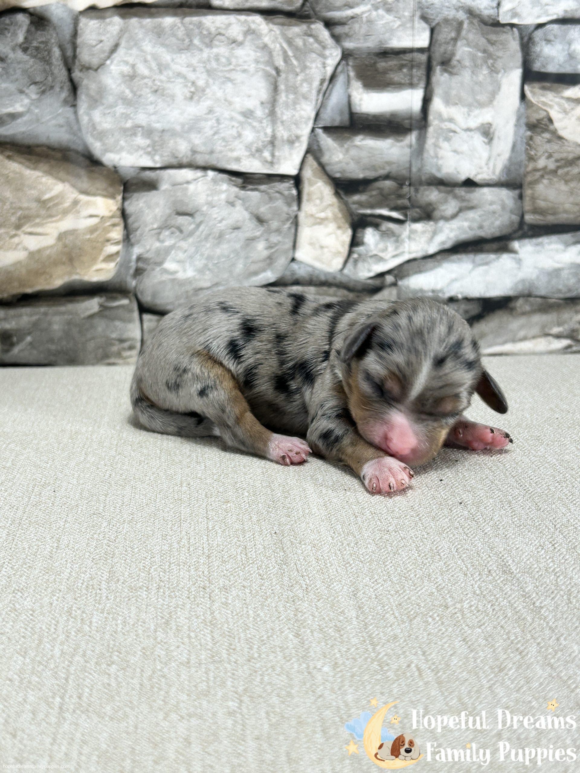 We’re really excited to introduce you to Fairy! She is an adorable Merle colored Mini Aussilier puppy who was recently born. At this tender age, she is already capturing hearts with her tiny paws and beautiful color. As she grows, she is sure to bring endless joy and companionship to those around her. 🐾💖