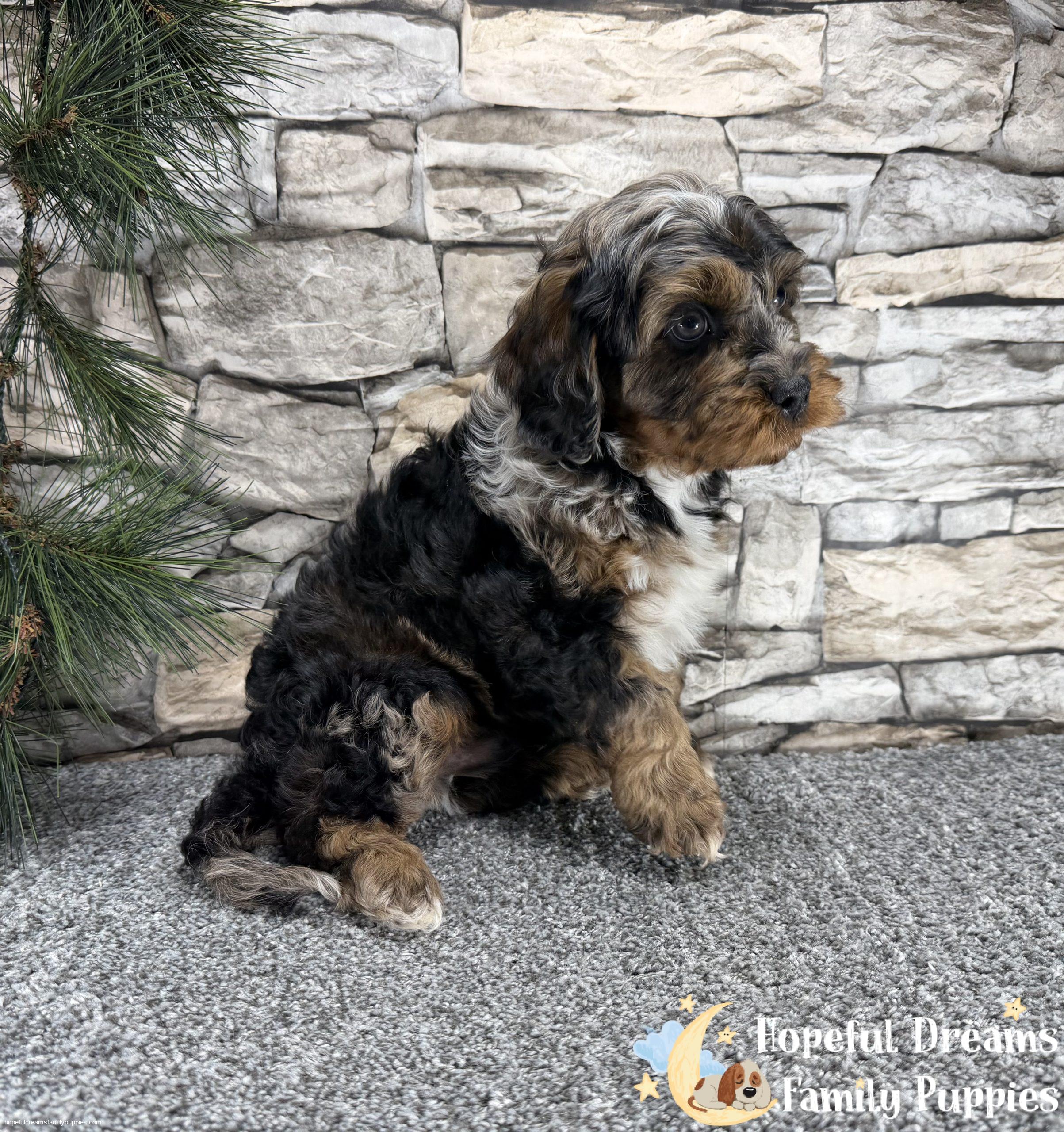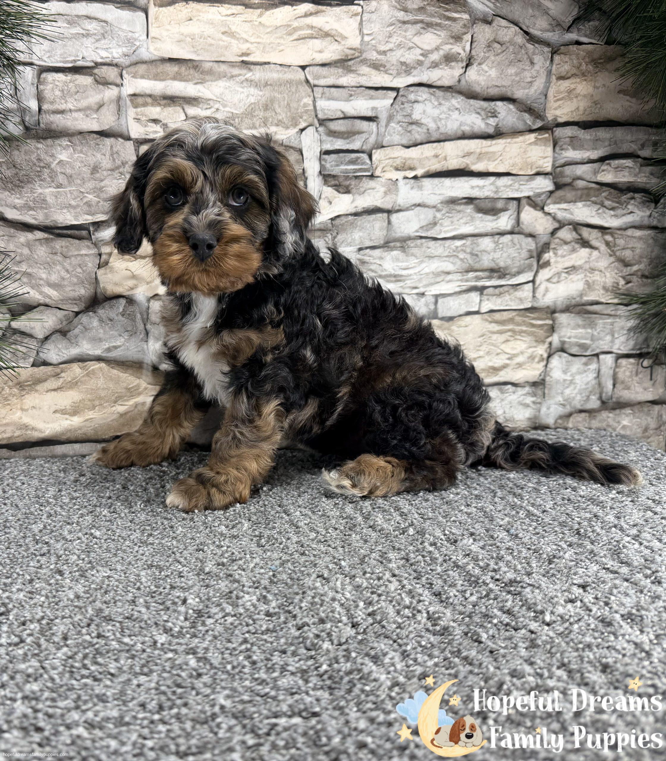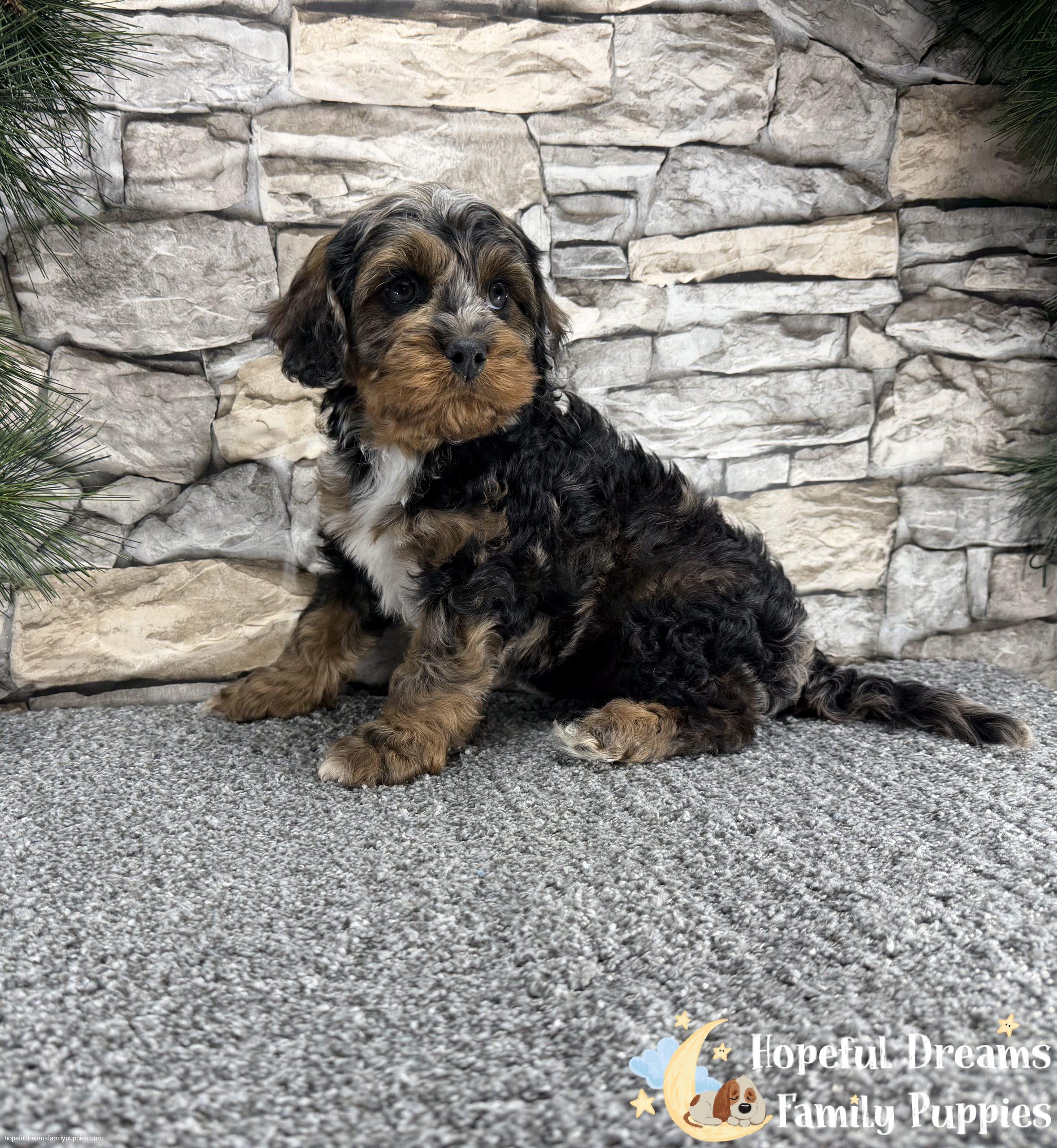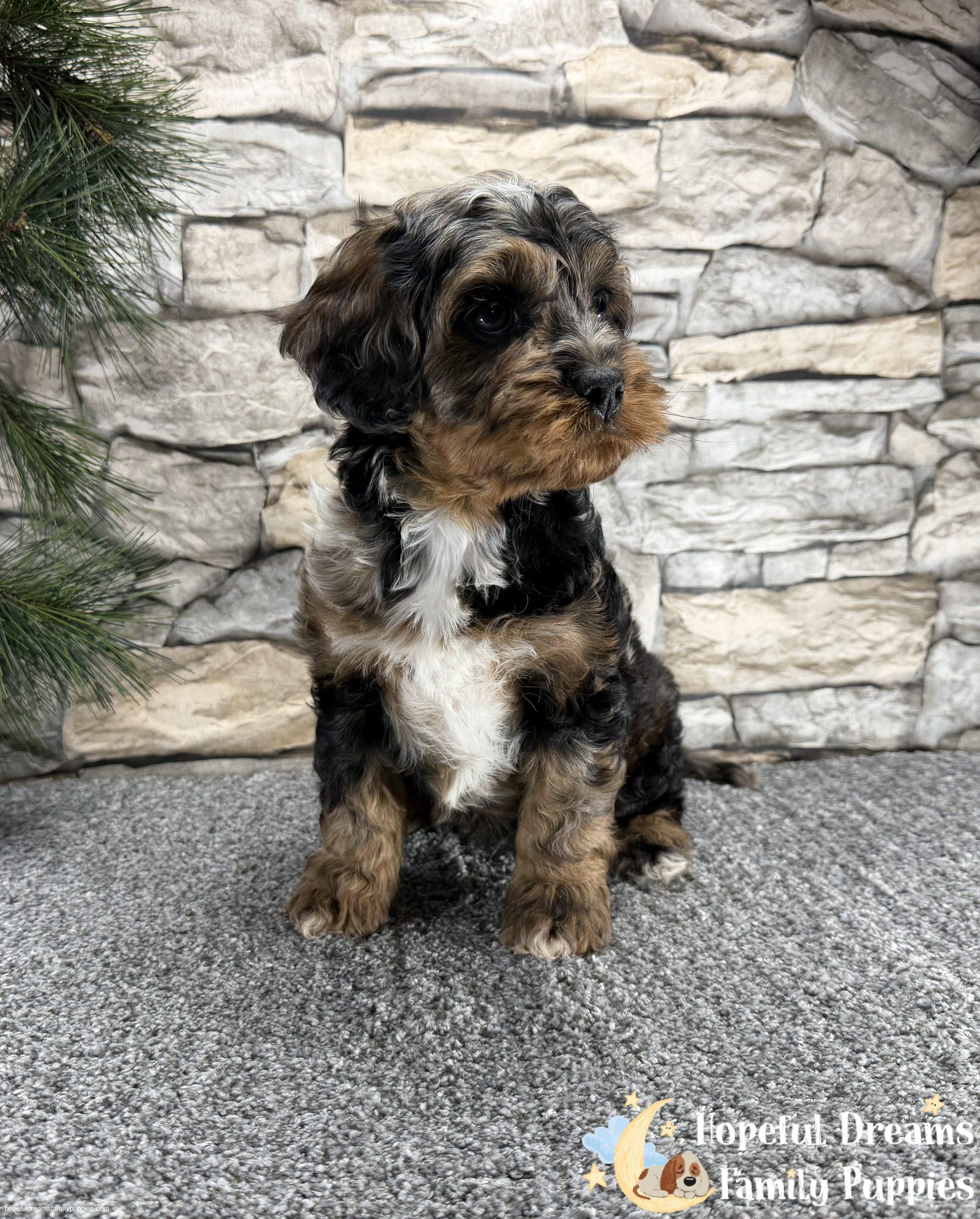 Amber is our sweet Cavapoo mom with a soft apricot curl coat, gentle temperament, and bright eyes. She loves cuddles and raises attentive puppies beautifully.