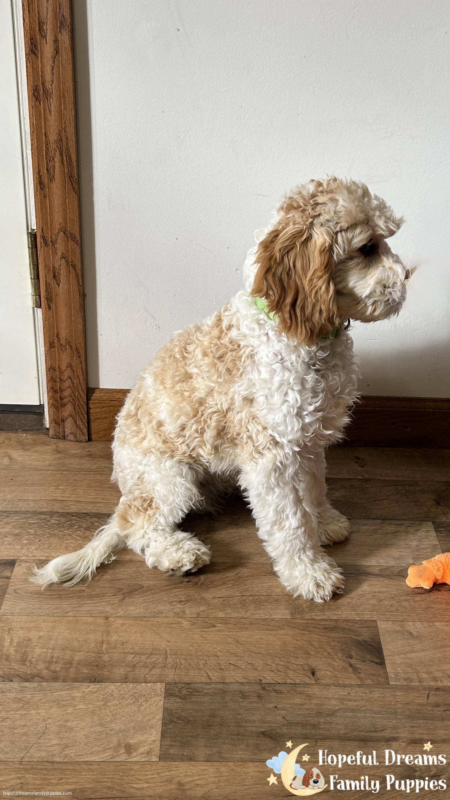 Stella and Indie are quite proud of this addition to their family, Bingo is a charming Blenheim-colored Cavapoo born on May 14, known for a playful and affectionate personality, a beautiful coat, and excellent health. This breed combines traits of Cavalier King Charles Spaniels and Poodles, making Bingo an ideal, hypoallergenic family pet. Ready for adoption with vaccinations and a starter kit, Bingo seeks a loving home to bring joy and companionship. He will surely make a great addition to your home.