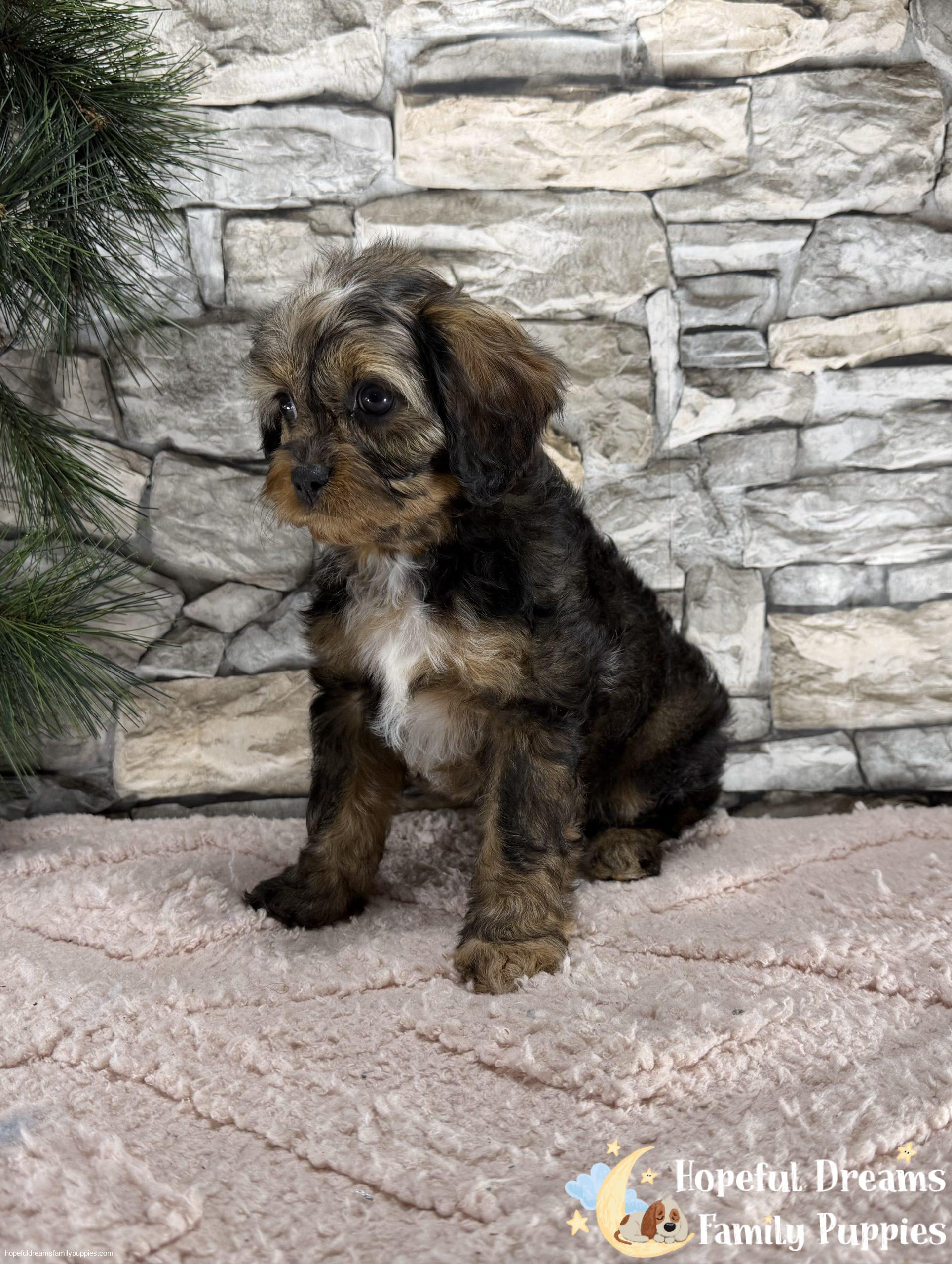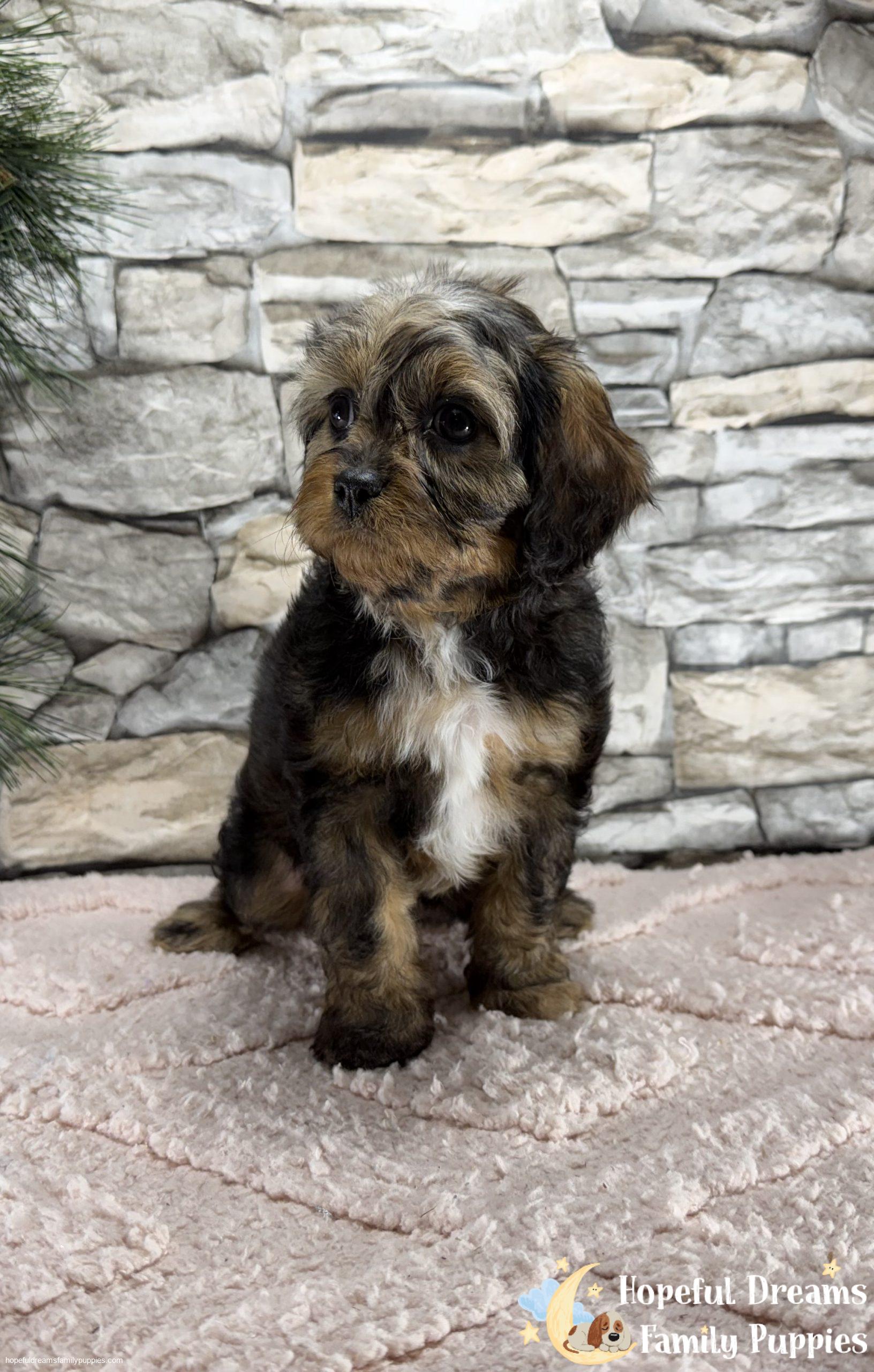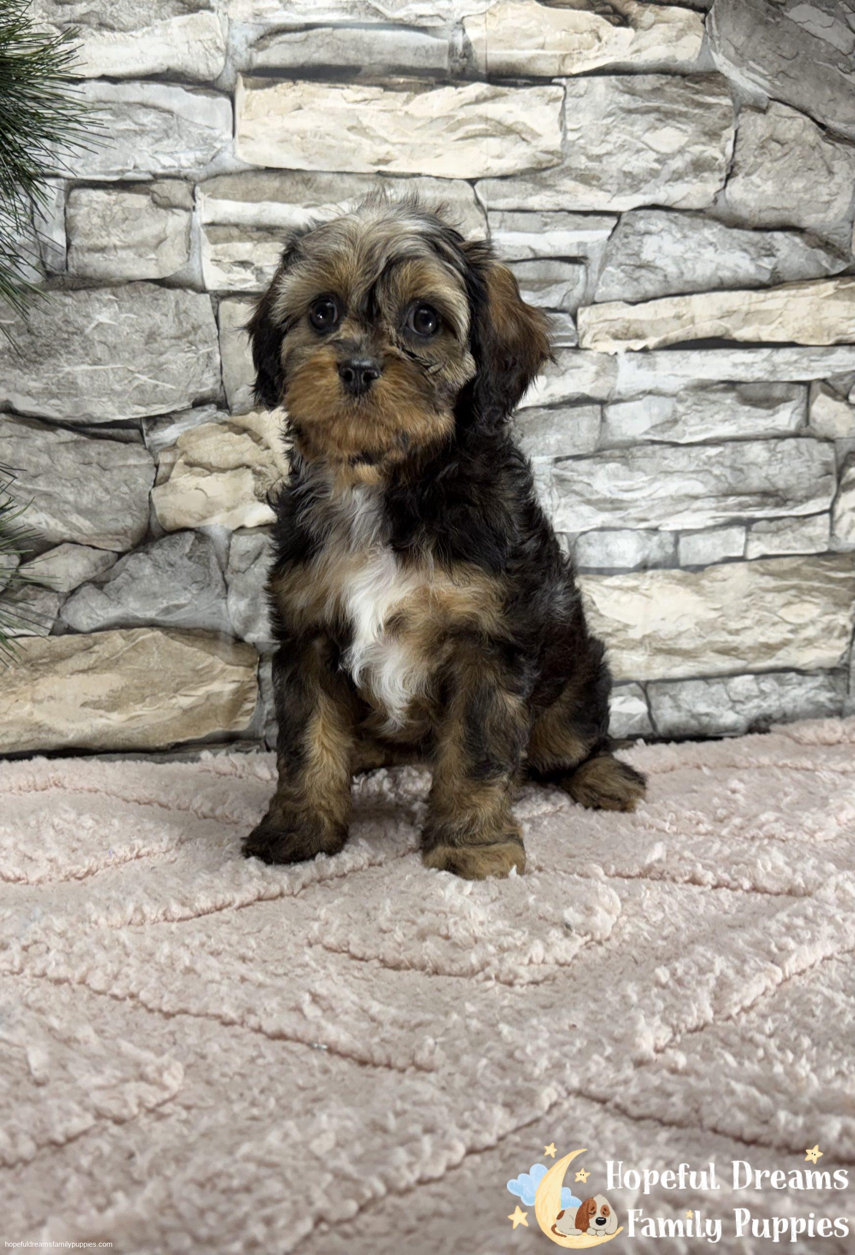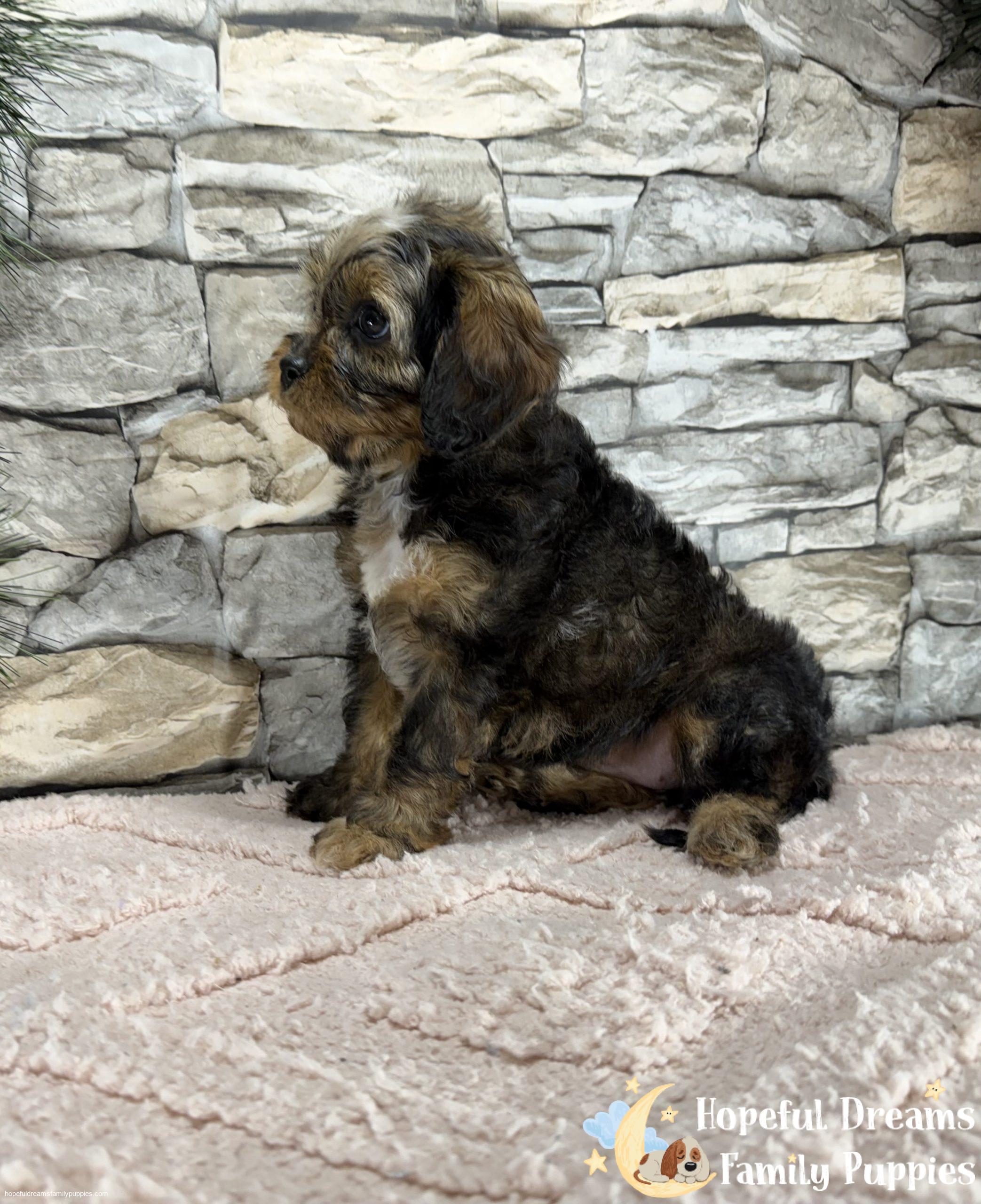 Amber is our sweet Cavapoo mom with a soft apricot curl coat, gentle temperament, and bright eyes. She loves cuddles and raises attentive puppies beautifully.