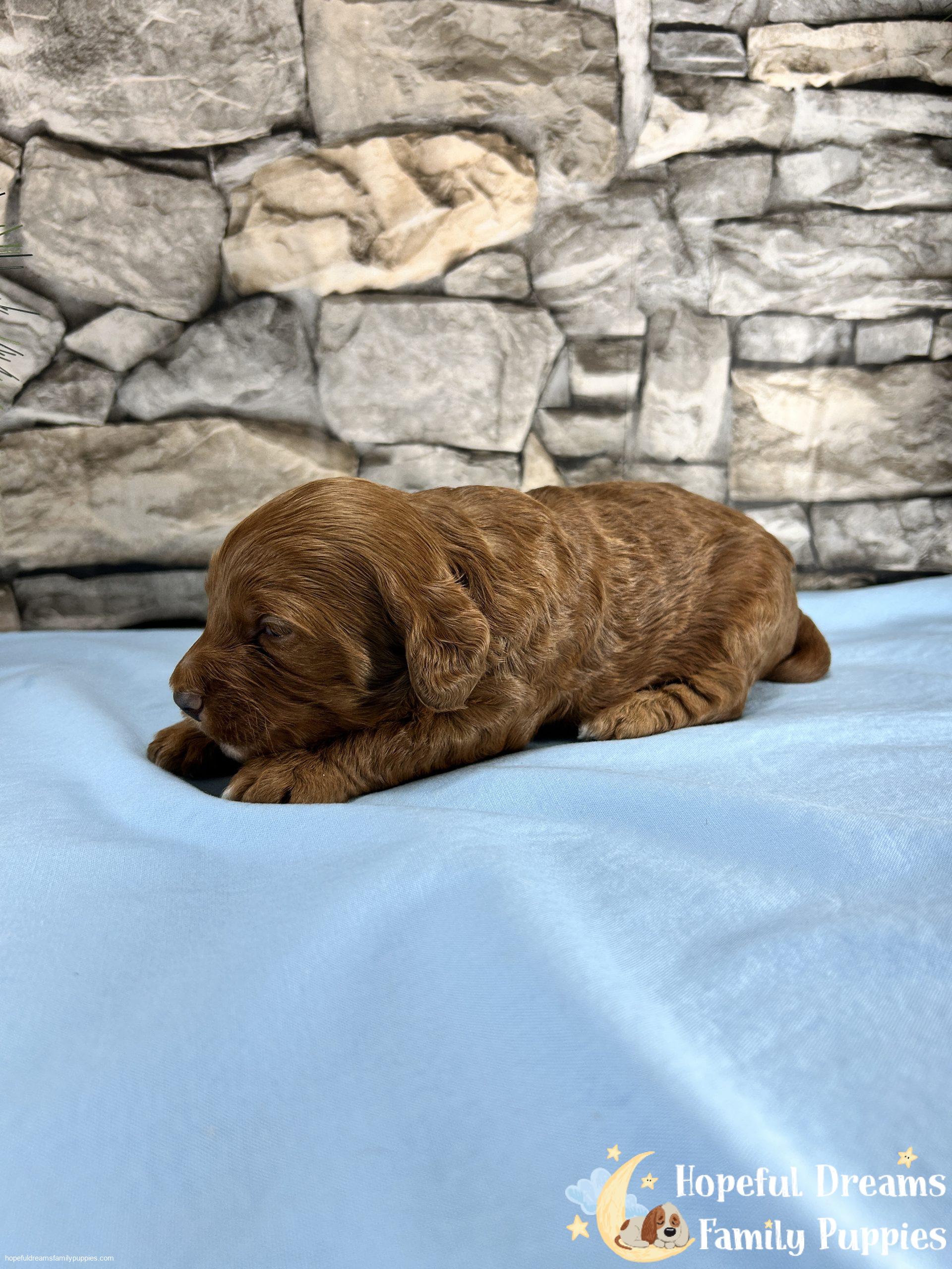 Mr Kade is a handsome male pup with very limited white markings. Because Kade has a Miniture Poodle parent, he will probably stand between 10 to 12 inches tall and weigh between 10 to 15 pounds. If you’re looking for a loving, intelligent, and low-shedding pet, this guy is a very good choice.