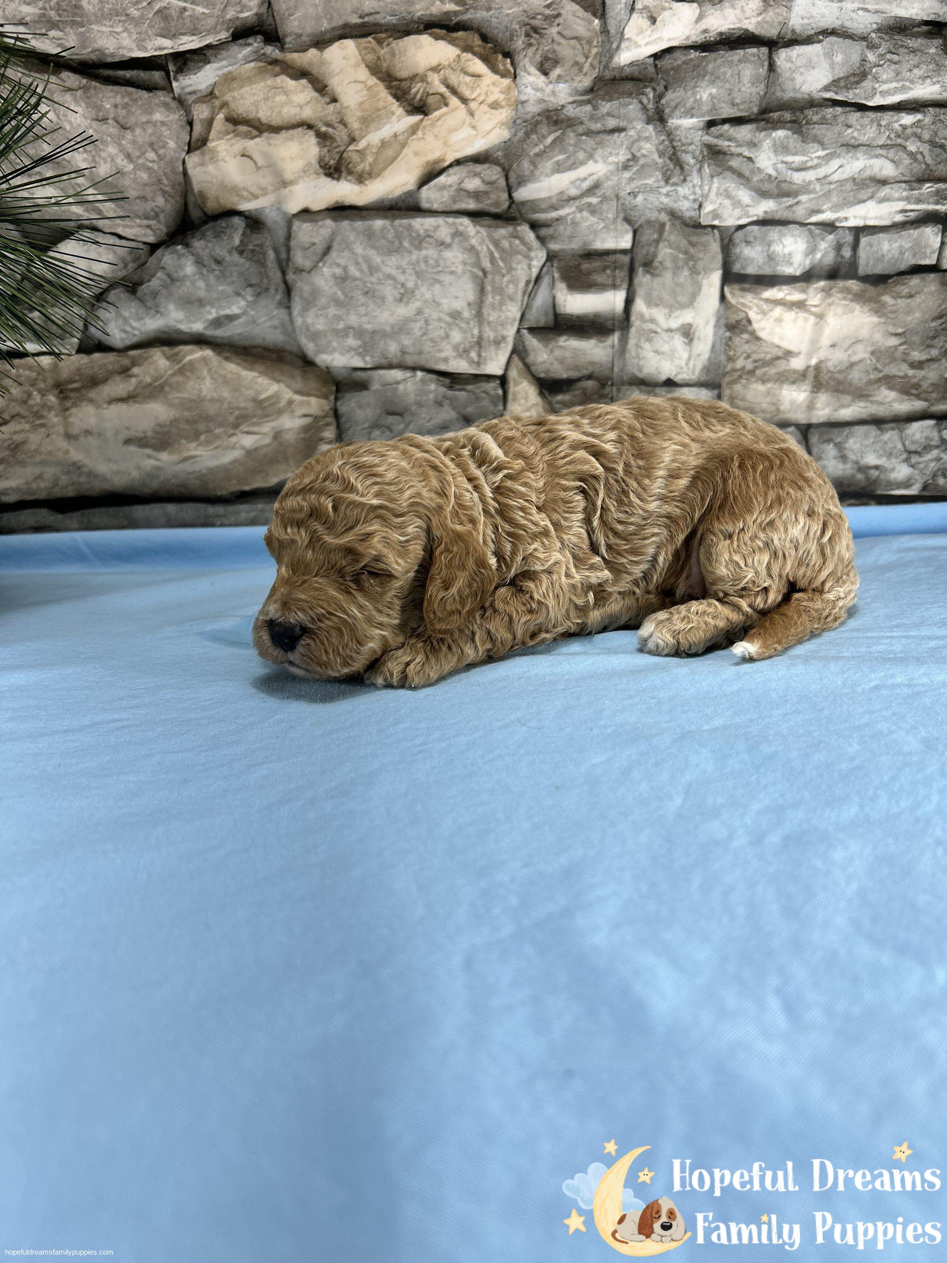 Mr Kenton is a handsome male pup that is tan with limited white markings. Because Kenton has a Miniture Poodle parent, he will probably stand between 10 to 12 inches tall and weigh between 10 to 15 pounds. If you’re looking for a loving, intelligent, and low-shedding pet, this guy is a very good choice.