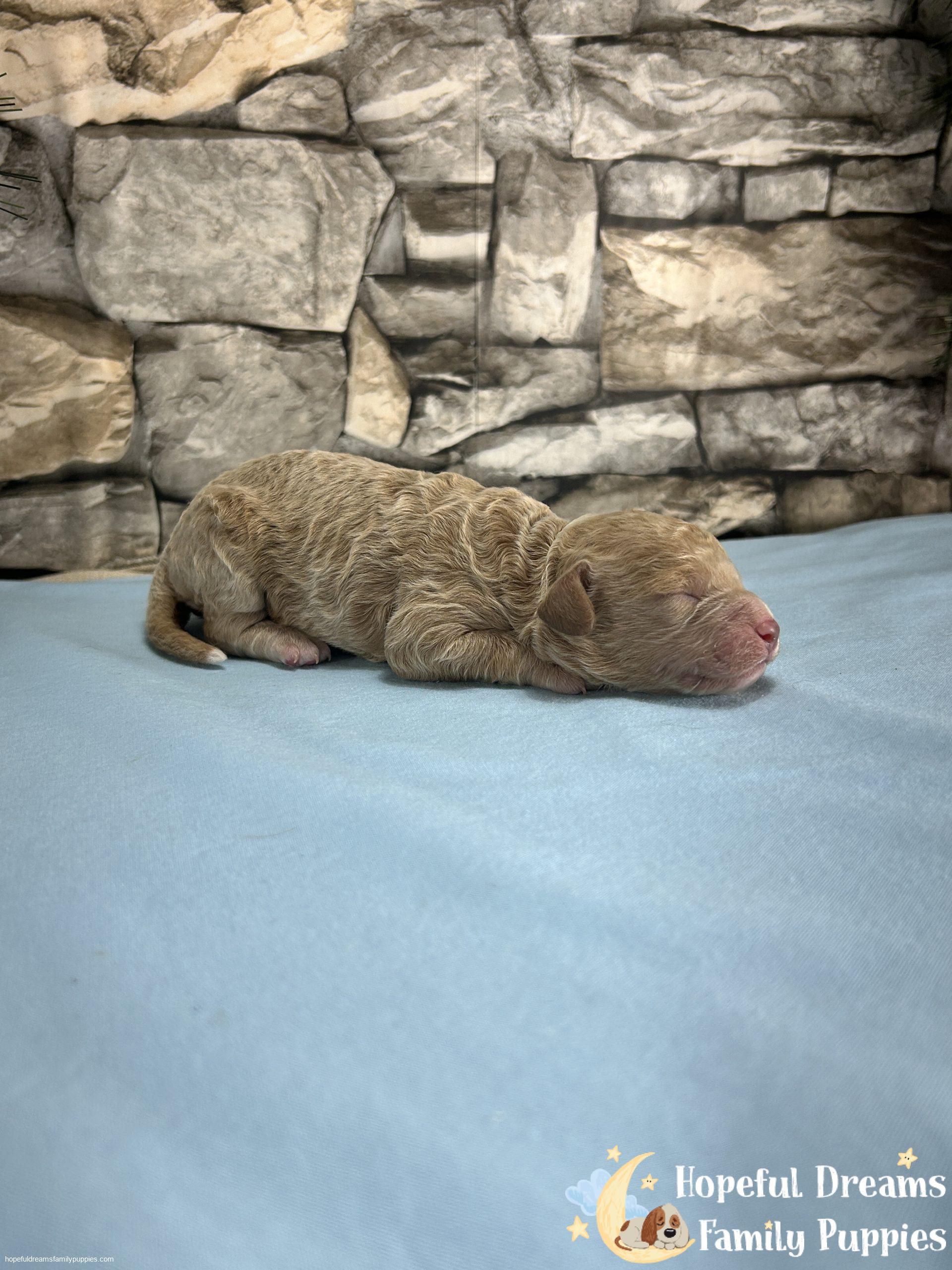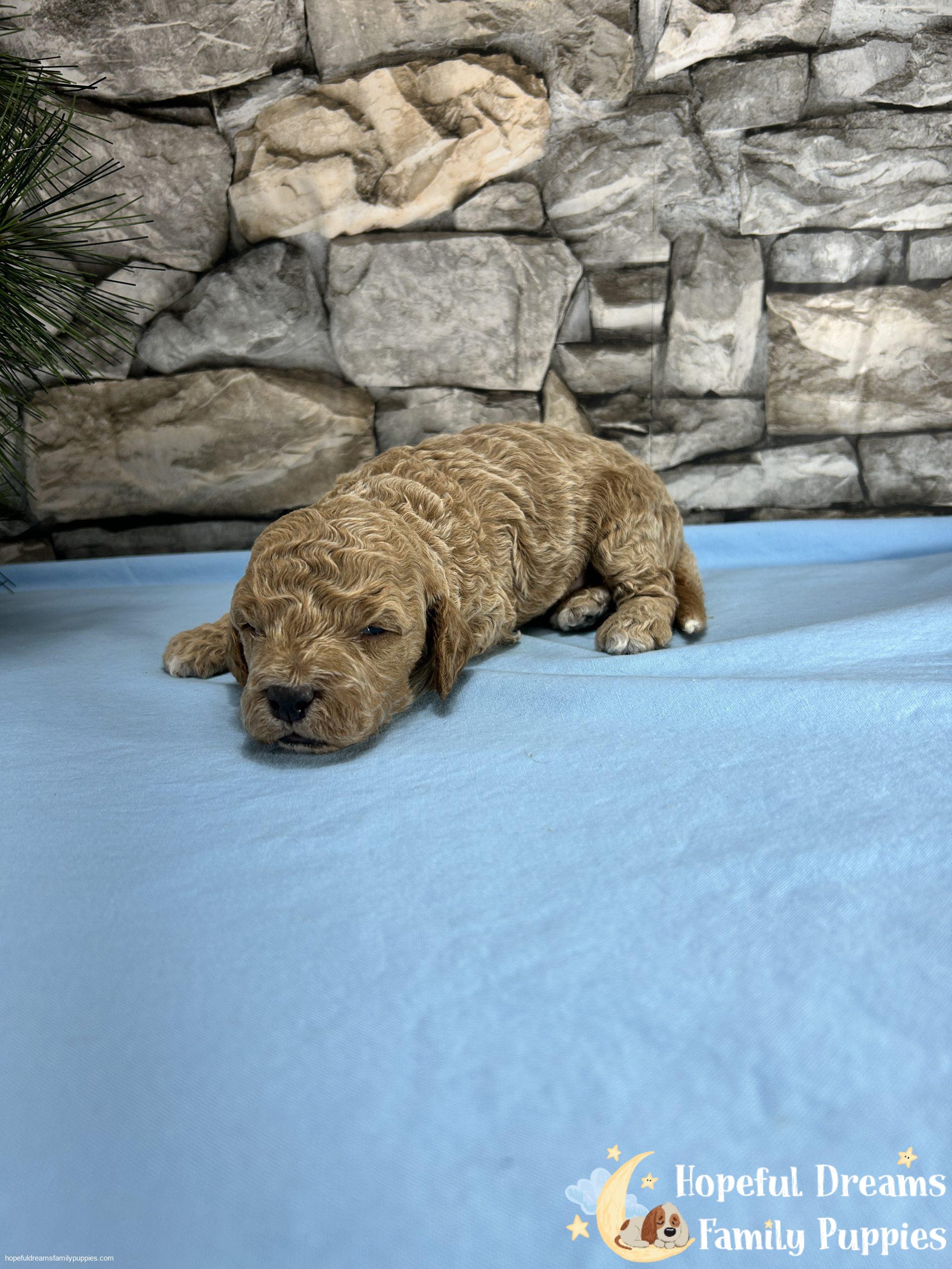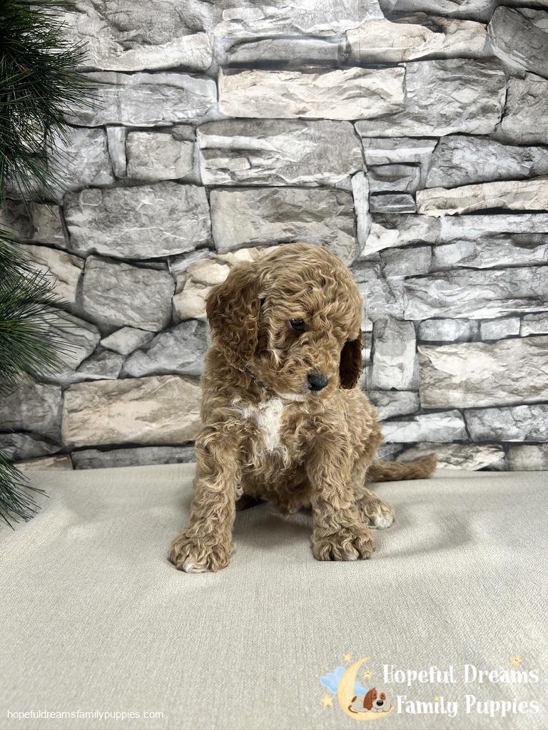 Mr Kenton is a handsome male pup that is tan with limited white markings. Because Kenton has a Miniture Poodle parent, he will probably stand between 10 to 12 inches tall and weigh between 10 to 15 pounds. If you’re looking for a loving, intelligent, and low-shedding pet, this guy is a very good choice.
