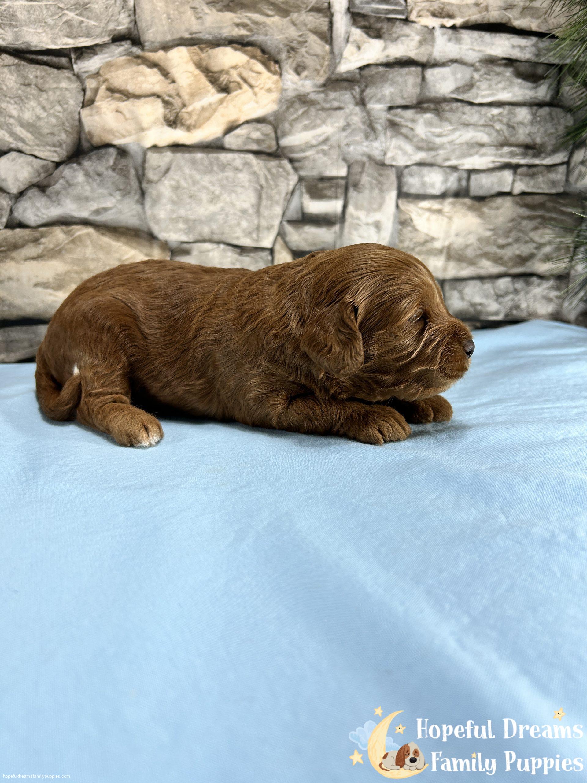Mr Kobie is a handsome pup with very limited white markings. Because Kobie has a Miniture Poodle parent, he will probably stand between 10 to 12 inches tall and weigh between 10 to 15 pounds. If you’re looking for a loving, intelligent, and low-shedding pet, this guy is a very good choice.