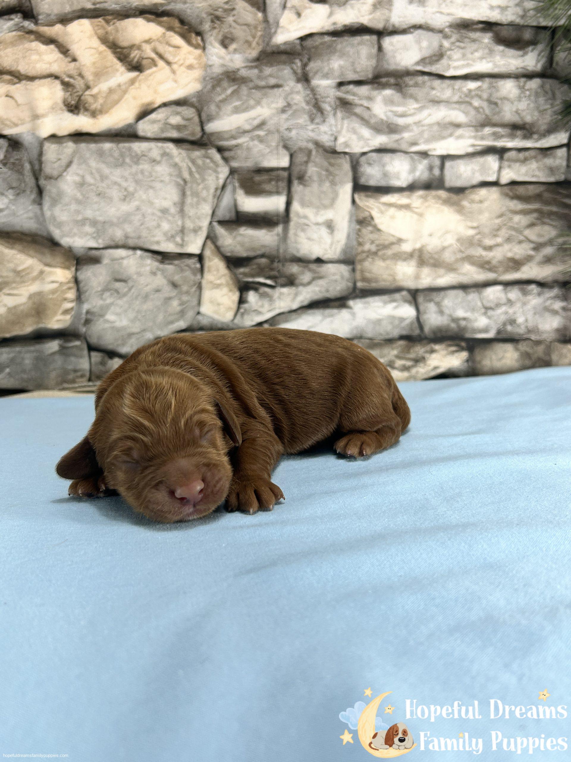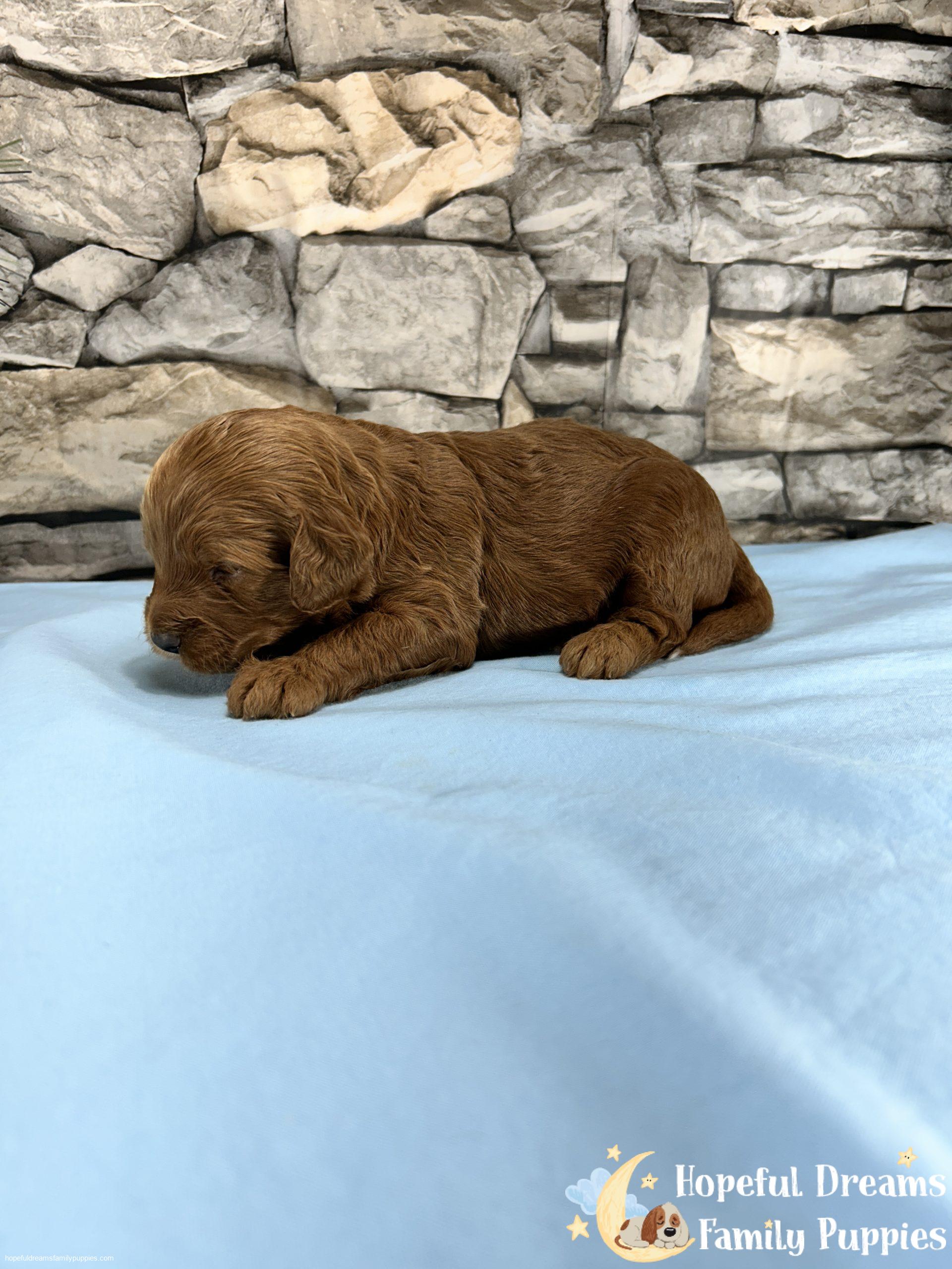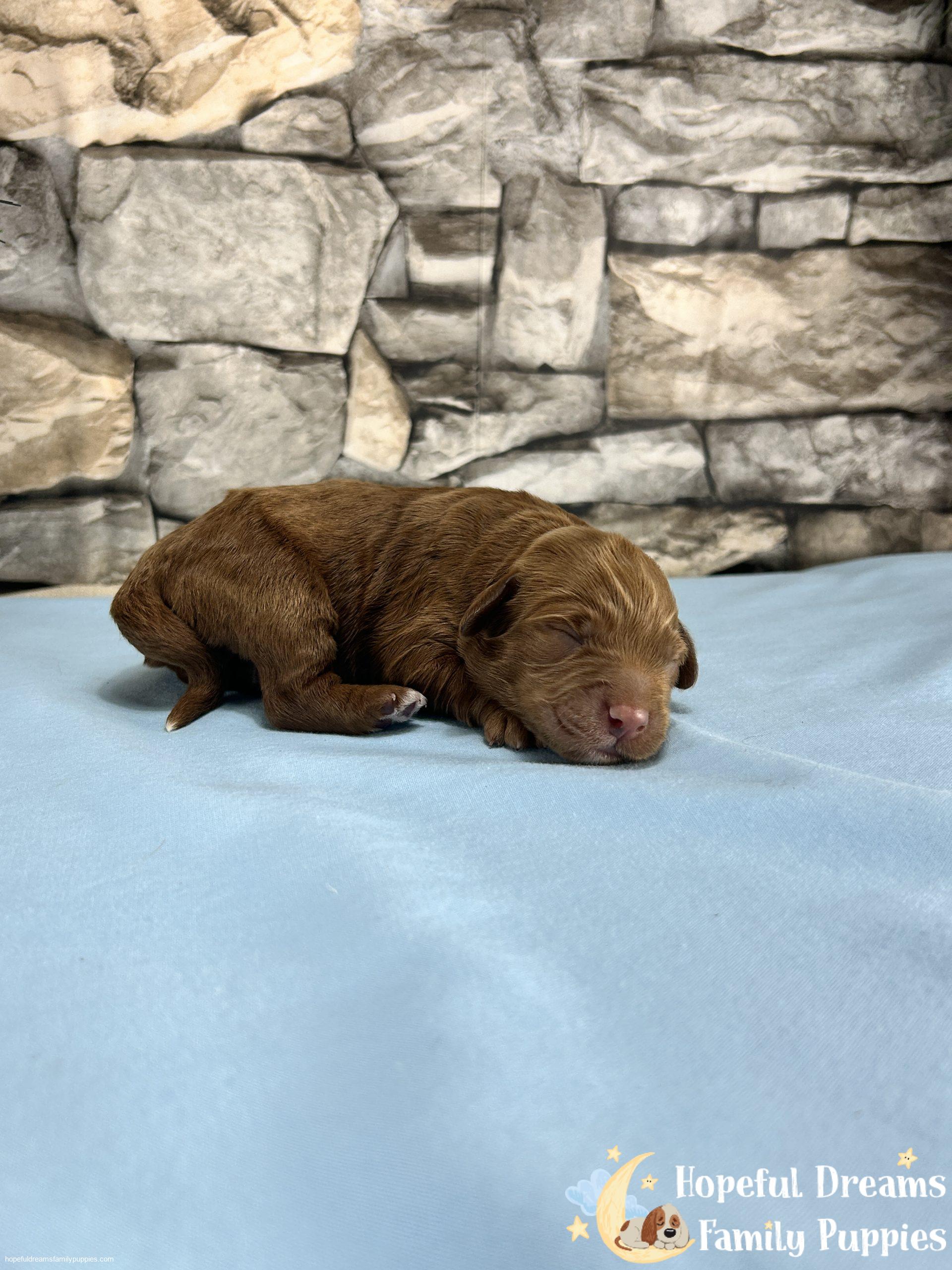 Mr Kobie is a handsome pup with very limited white markings. Because Kobie has a Miniture Poodle parent, he will probably stand between 10 to 12 inches tall and weigh between 10 to 15 pounds. If you’re looking for a loving, intelligent, and low-shedding pet, this guy is a very good choice.