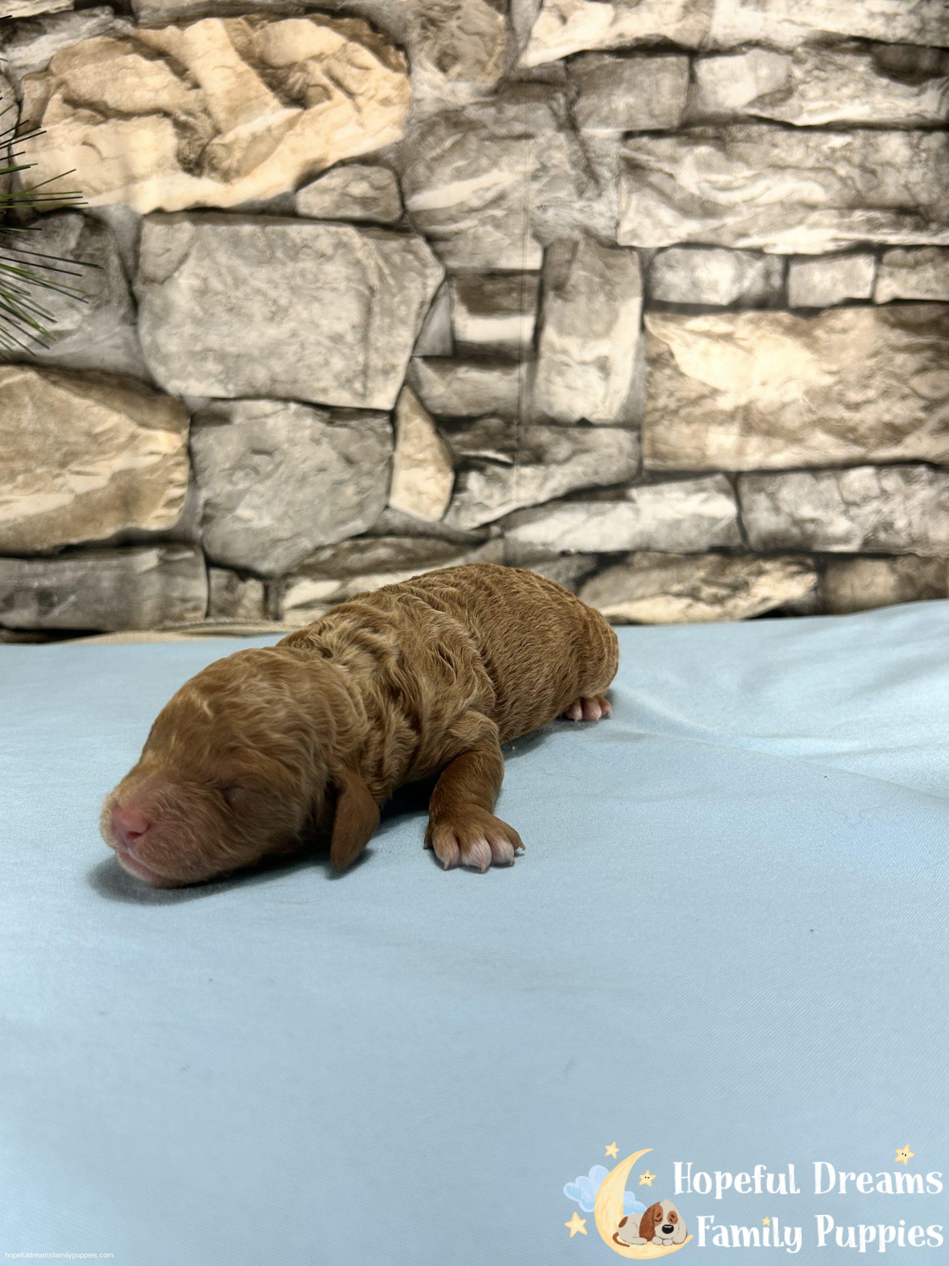 Mr Kurby is a handsome pup with very limited white markings. Because Kurby has a Miniture Poodle parent, he will probably stand between 10 to 12 inches tall and weigh between 10 to 15 pounds. If you’re looking for a loving, intelligent, and low-shedding pet, this guy is a very good choice.