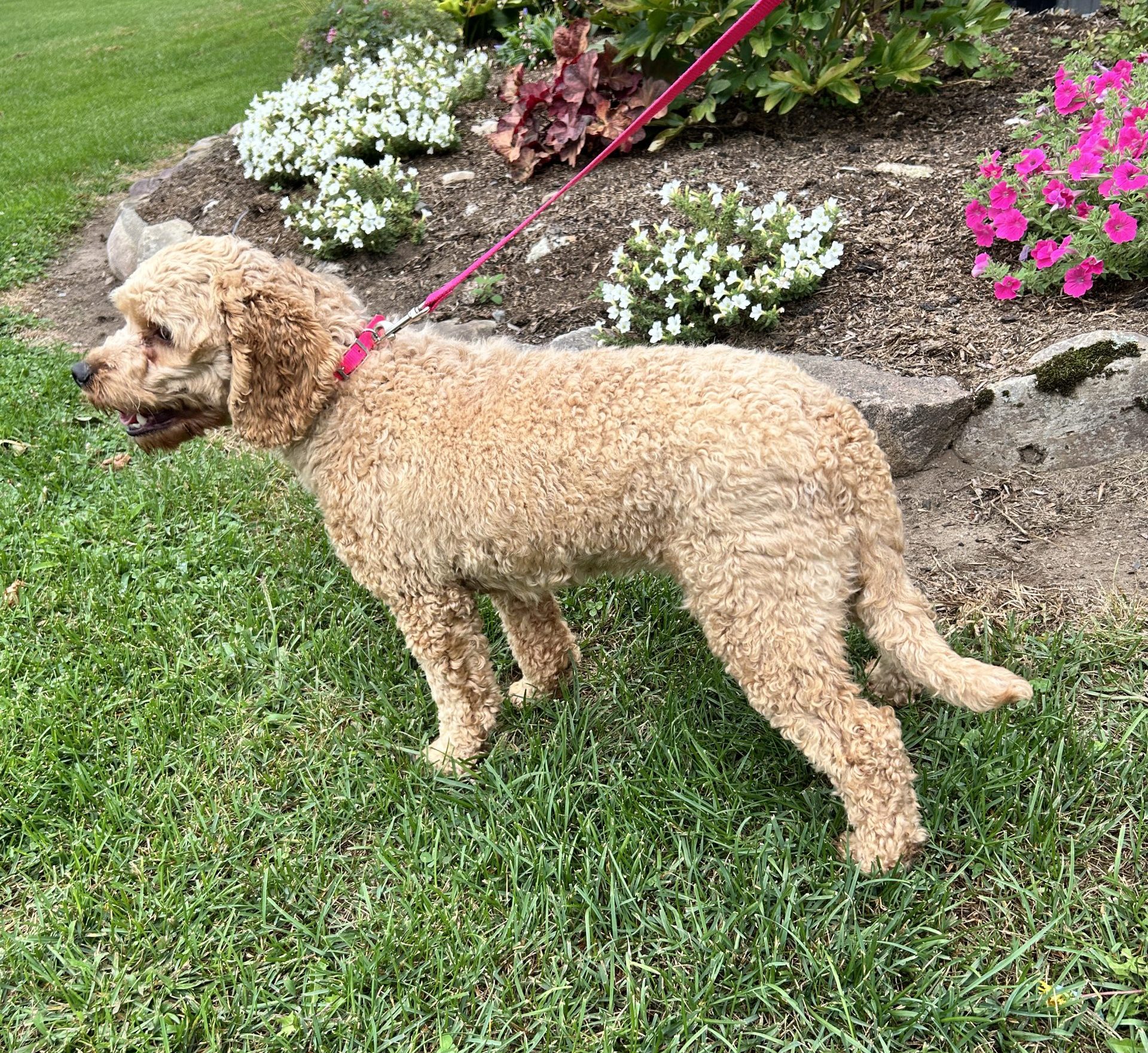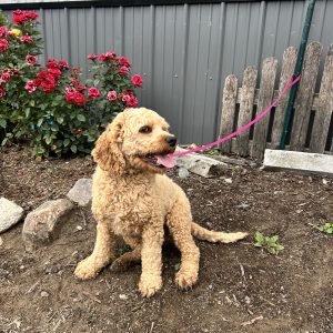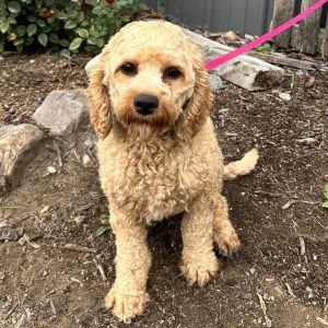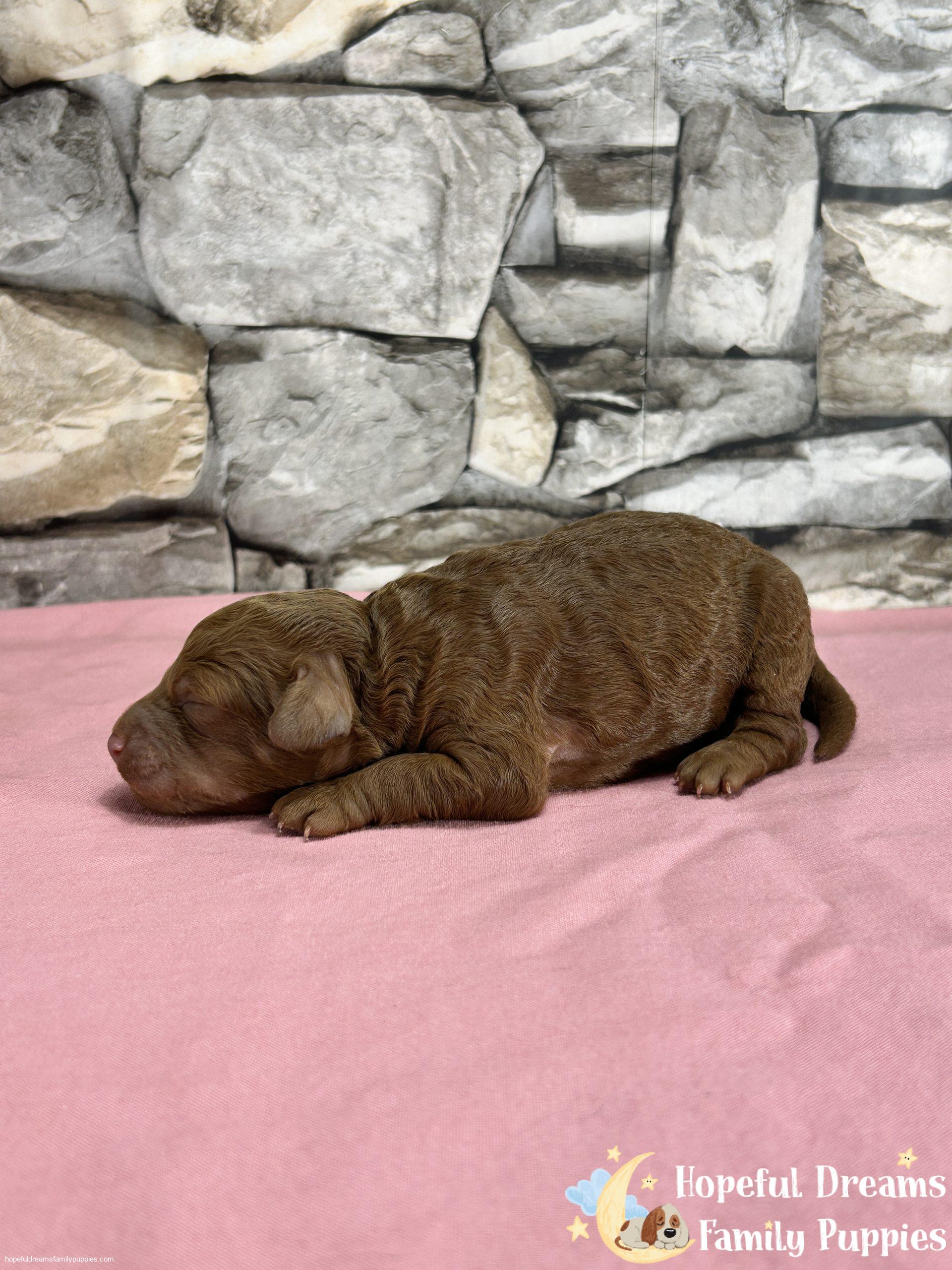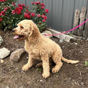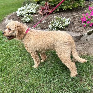 Ms. Kaya is a pretty female pup that is deep red with limited white markings. Because Kenya has a Miniture Poodle parent, she will probably stand between 10 to 12 inches tall and weigh between 10 to 15 pounds. If you’re looking for a loving, intelligent, and low-shedding pet, this cutie is a very good choice.