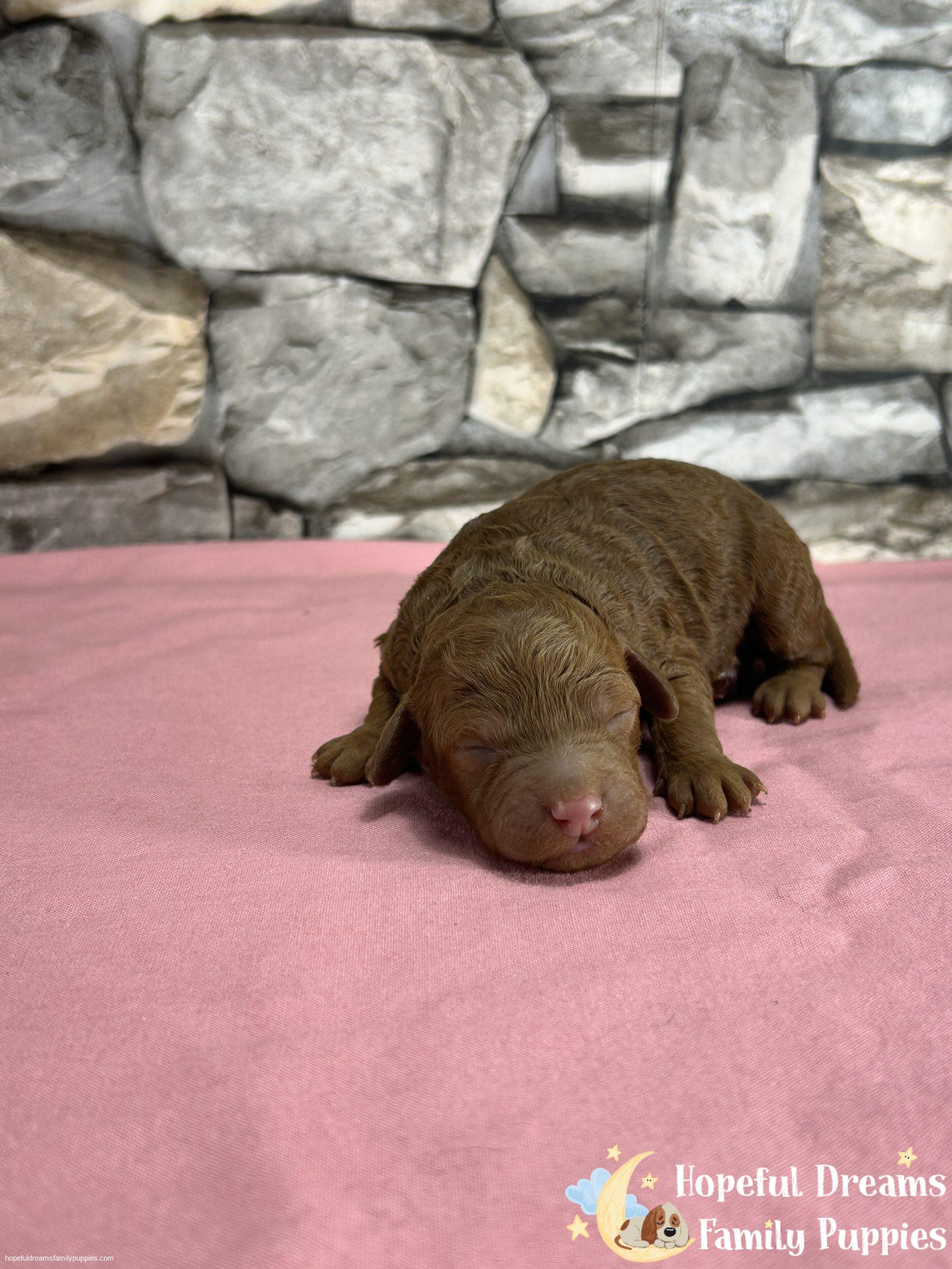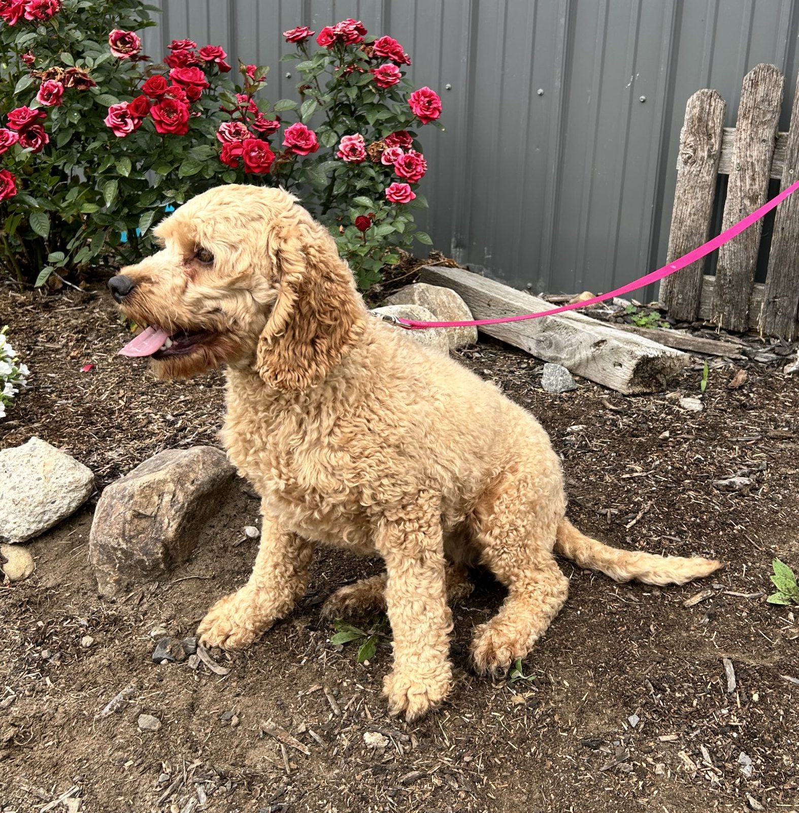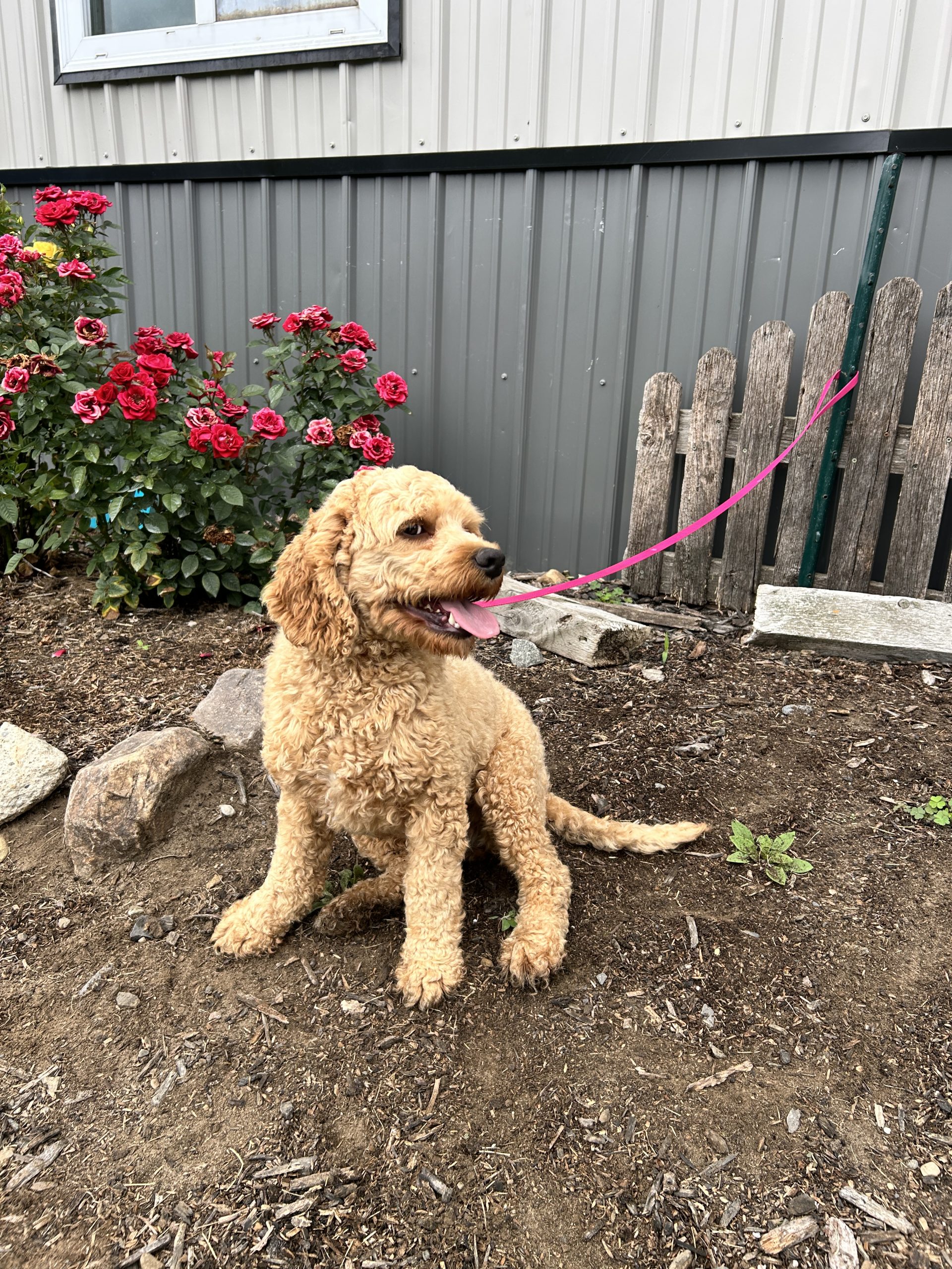 Ms. Kaya is a pretty female pup that is deep red with limited white markings. Because Kenya has a Miniture Poodle parent, she will probably stand between 10 to 12 inches tall and weigh between 10 to 15 pounds. If you’re looking for a loving, intelligent, and low-shedding pet, this cutie is a very good choice.