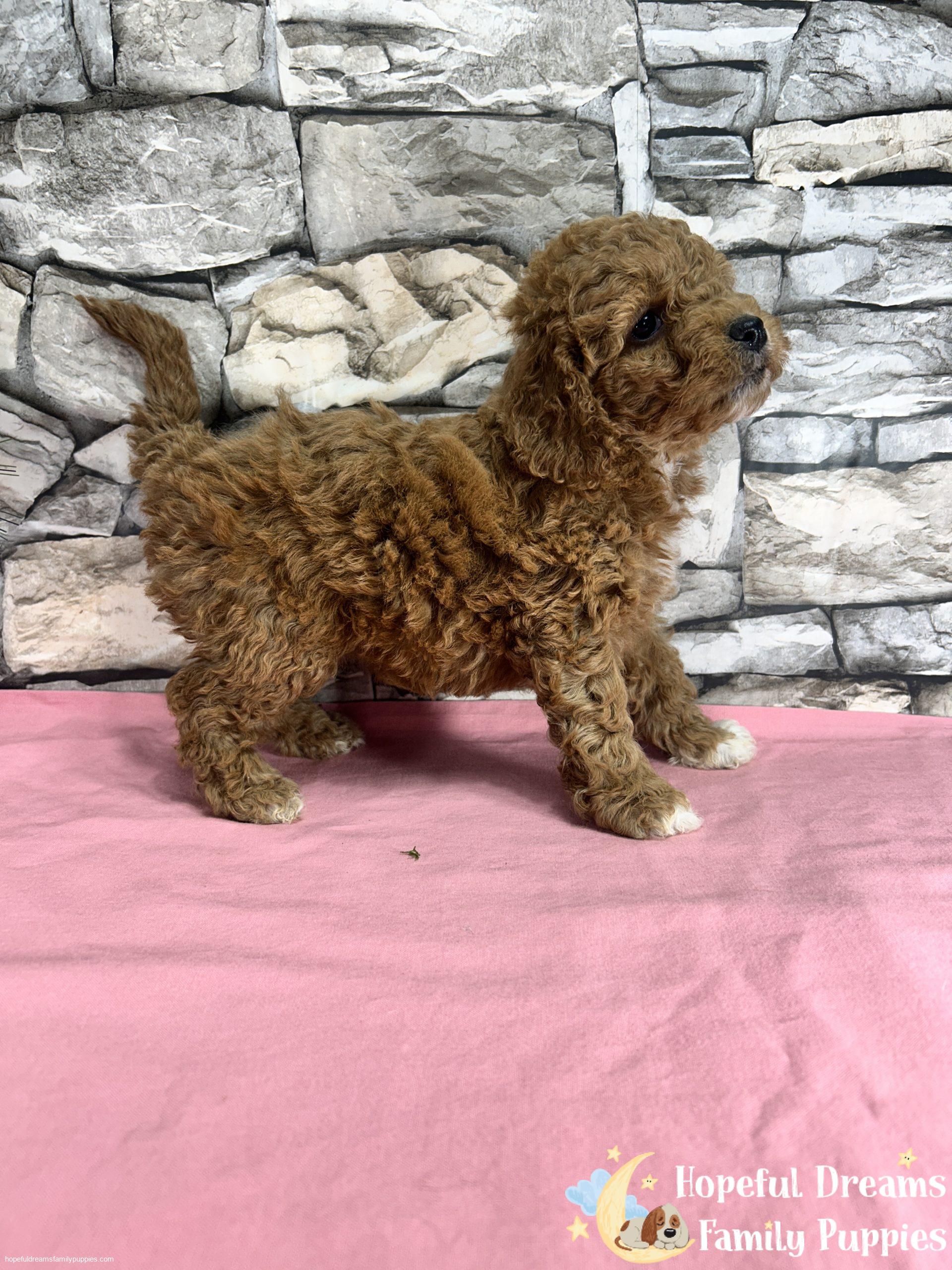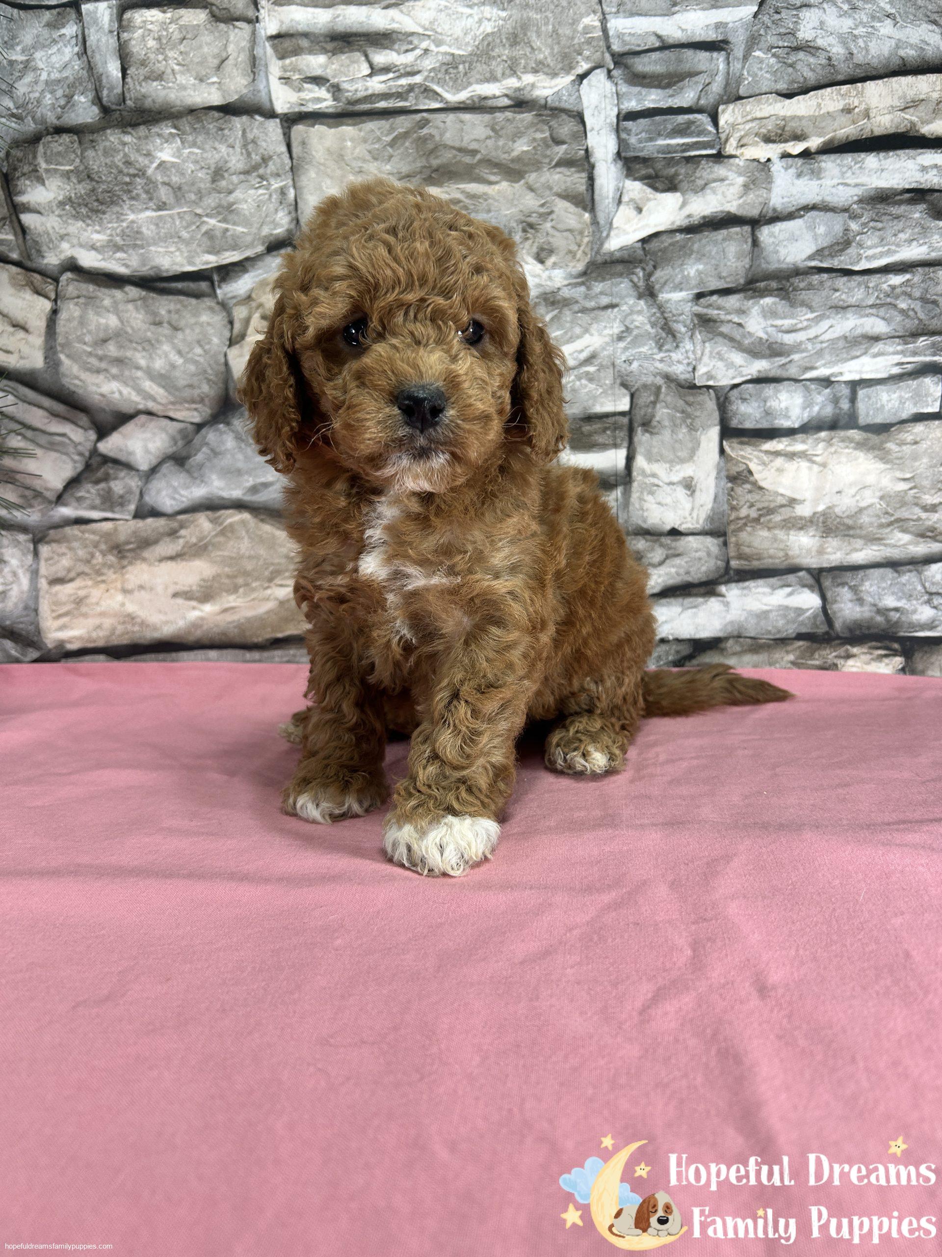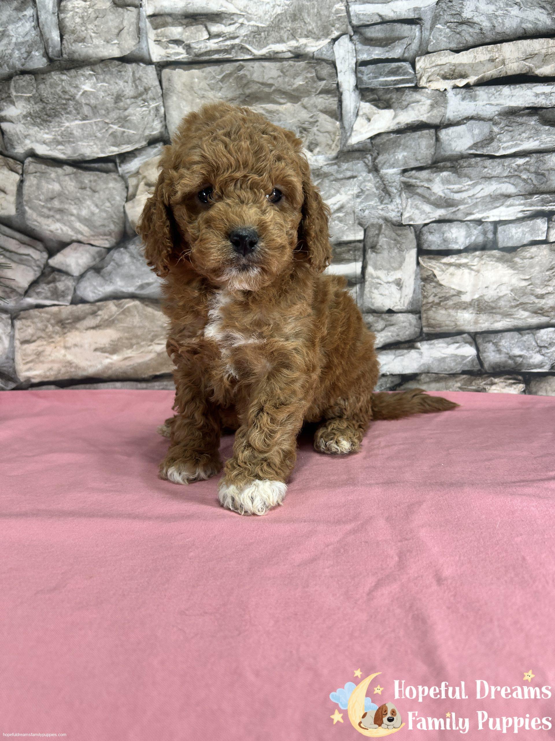 Ms. Kenya is a pretty female pup that is deep red with limited white markings(white toes on all four feet). Because Kenya has a Miniture Poodle parent, she will probably stand between 10 to 12 inches tall and weigh between 10 to 15 pounds. If you’re looking for a loving, intelligent, and low-shedding pet, this cutie is a very good choice.