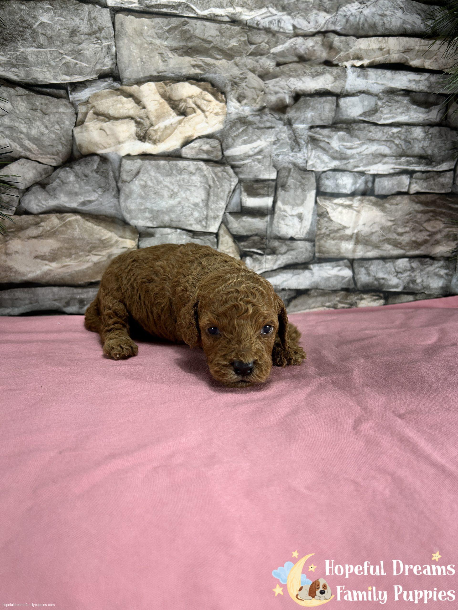 Ms. Kensie is a pretty female pup that is deep red with limited white markings. Because Kensie has a Miniture Poodle parent, she will probably stand between 10 to 12 inches tall and weigh between 10 to 15 pounds. If you’re looking for a loving, intelligent, and low-shedding pet, this cutie is a very good choice.