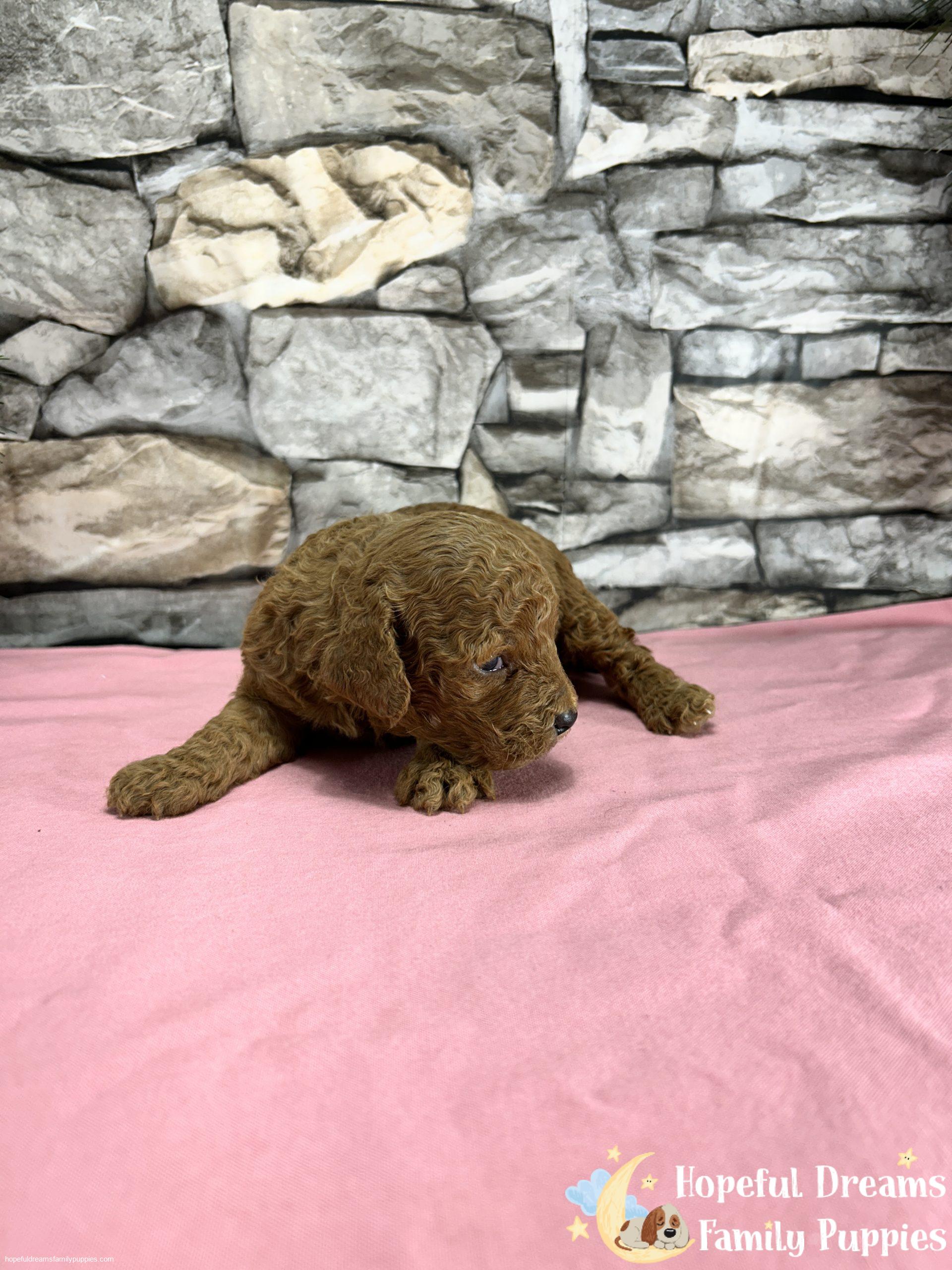 Ms. Kensie is a pretty female pup that is deep red with limited white markings. Because Kensie has a Miniture Poodle parent, she will probably stand between 10 to 12 inches tall and weigh between 10 to 15 pounds. If you’re looking for a loving, intelligent, and low-shedding pet, this cutie is a very good choice.