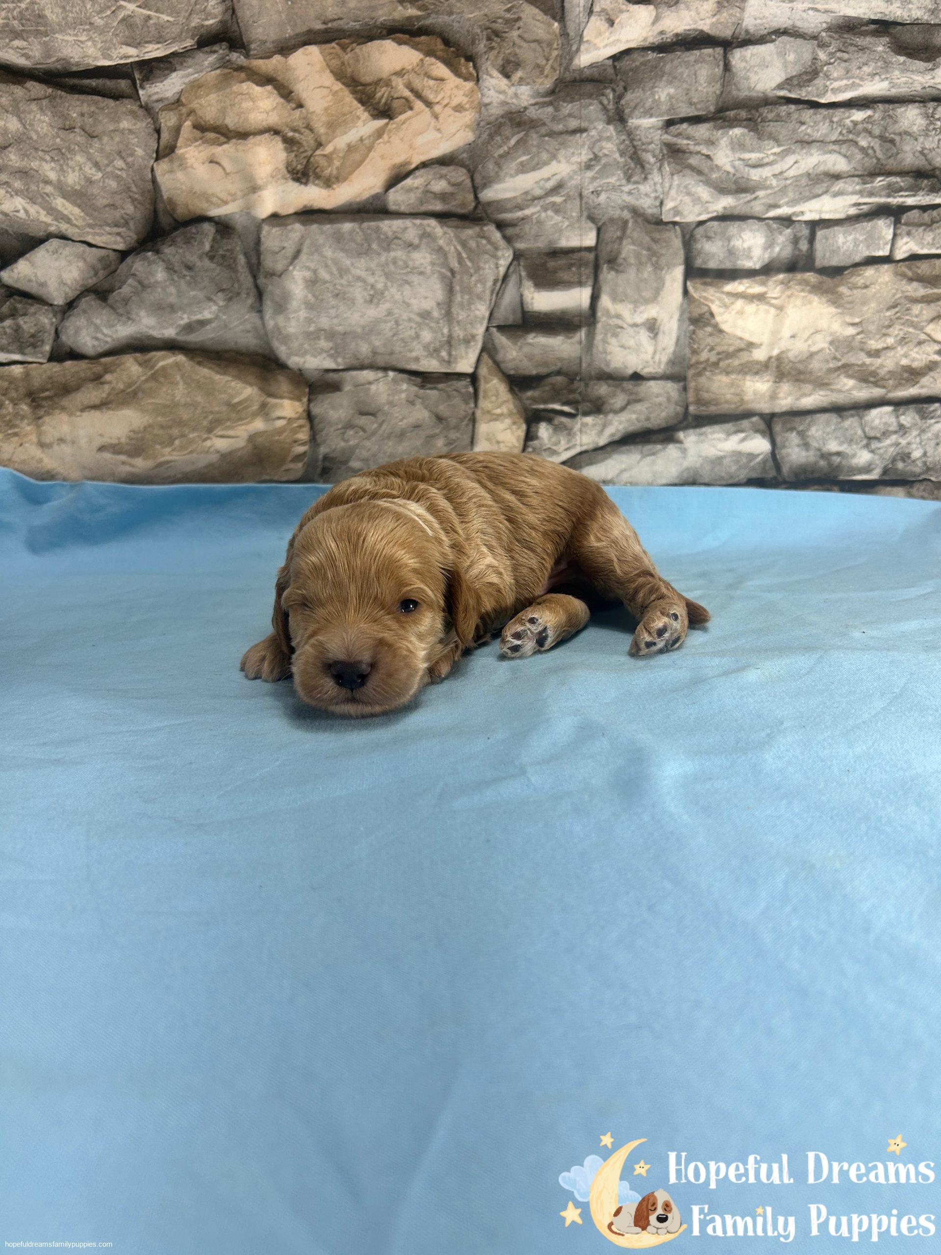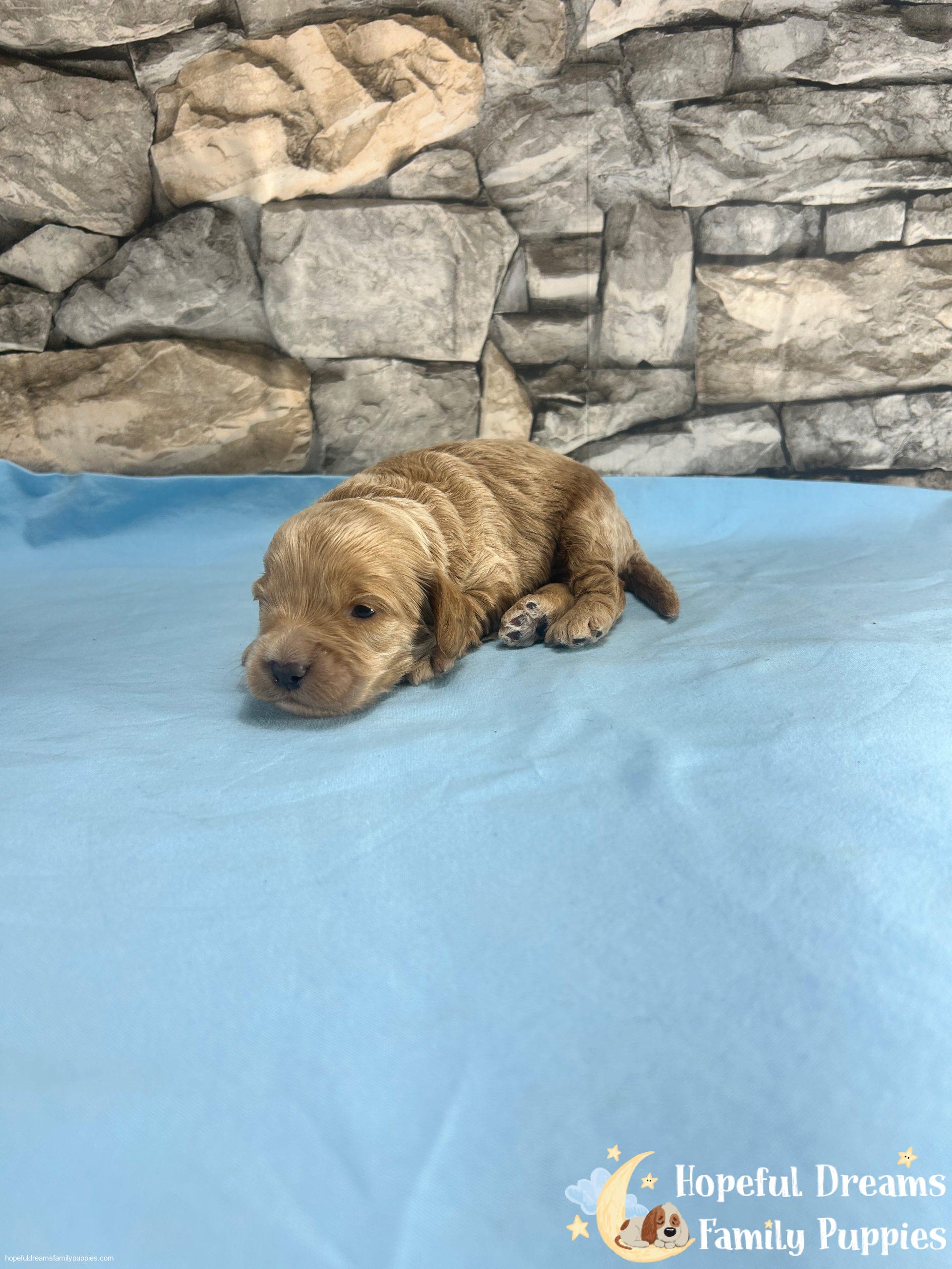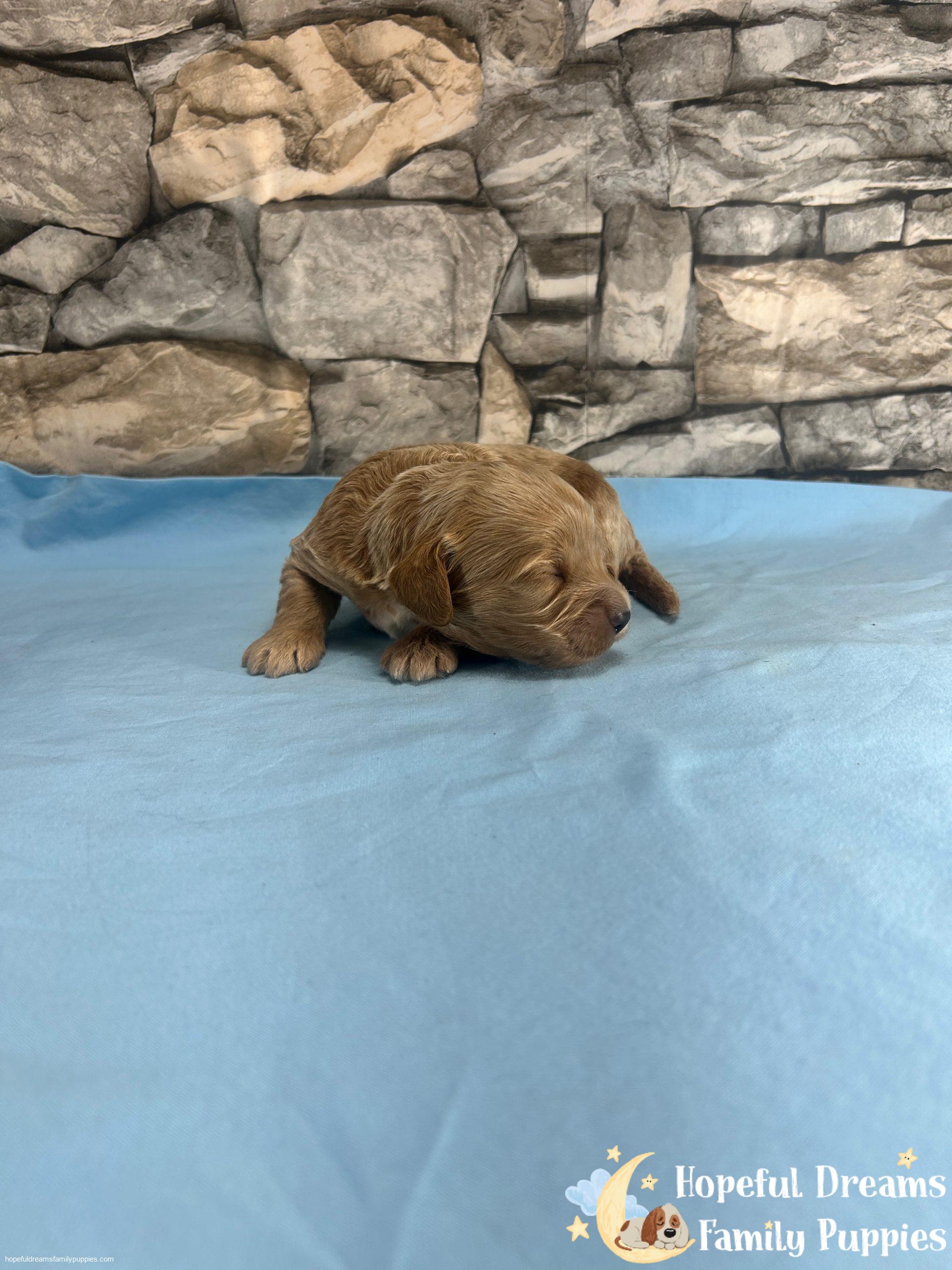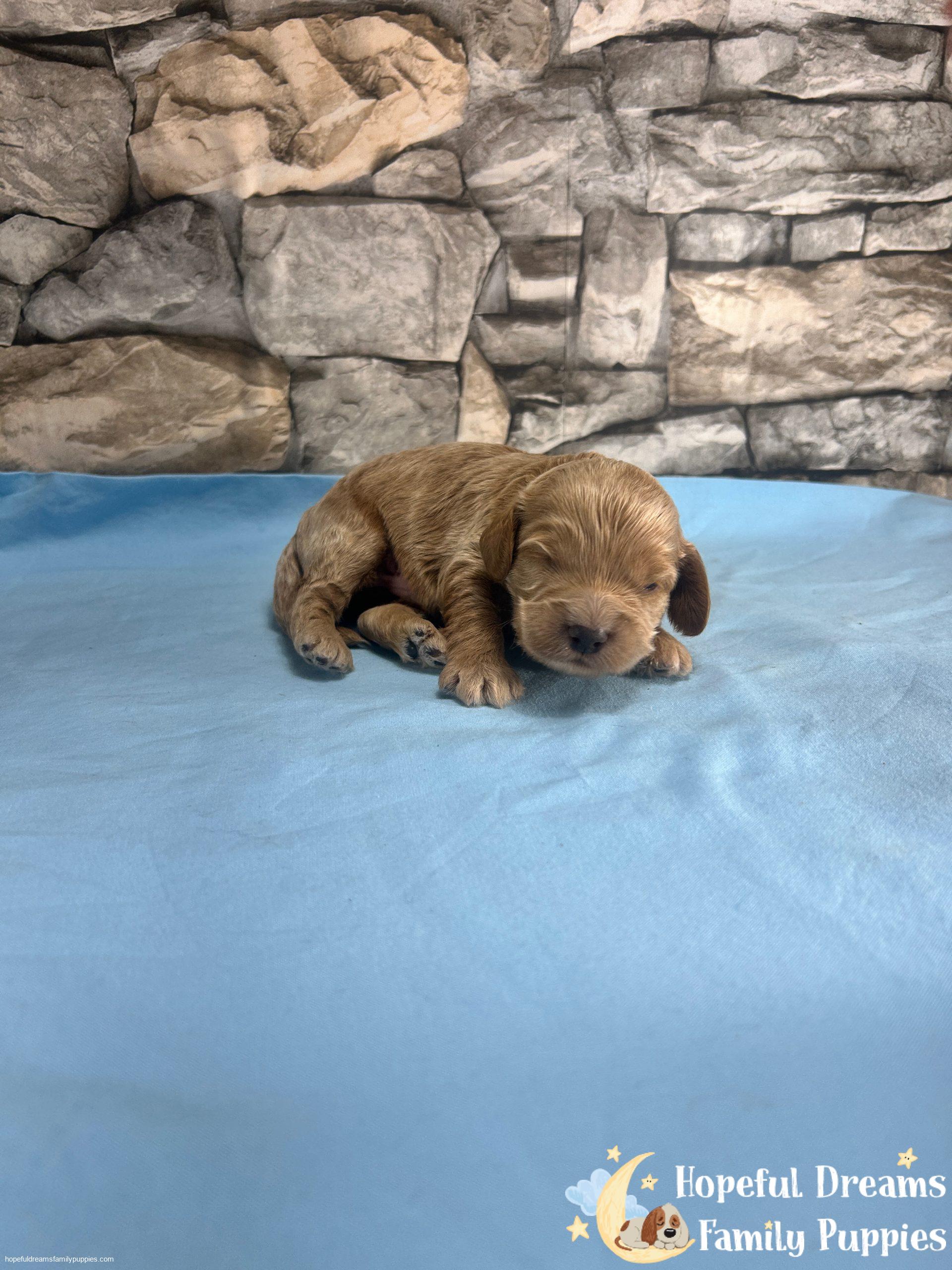 Mr. Ripple is a handsome boy that is light tan color that sets him apart from the other puppies. Because Ripple has a Miniture Poodle parent, He will probably stand between 10 to 12 inches tall and weigh between 10 to 15 pounds. If you’re looking for a loving, intelligent, and low-shedding pet, this cutie is a very good choice.